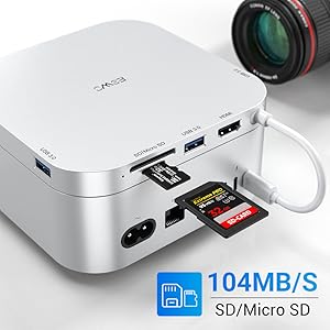 - 【SD/Micro SD Card Reader】TF/SD card slots support up to 104MB/s transfer speed, ideal for data backup and quick access to photos and media. Effortlessly capture and share data or media.