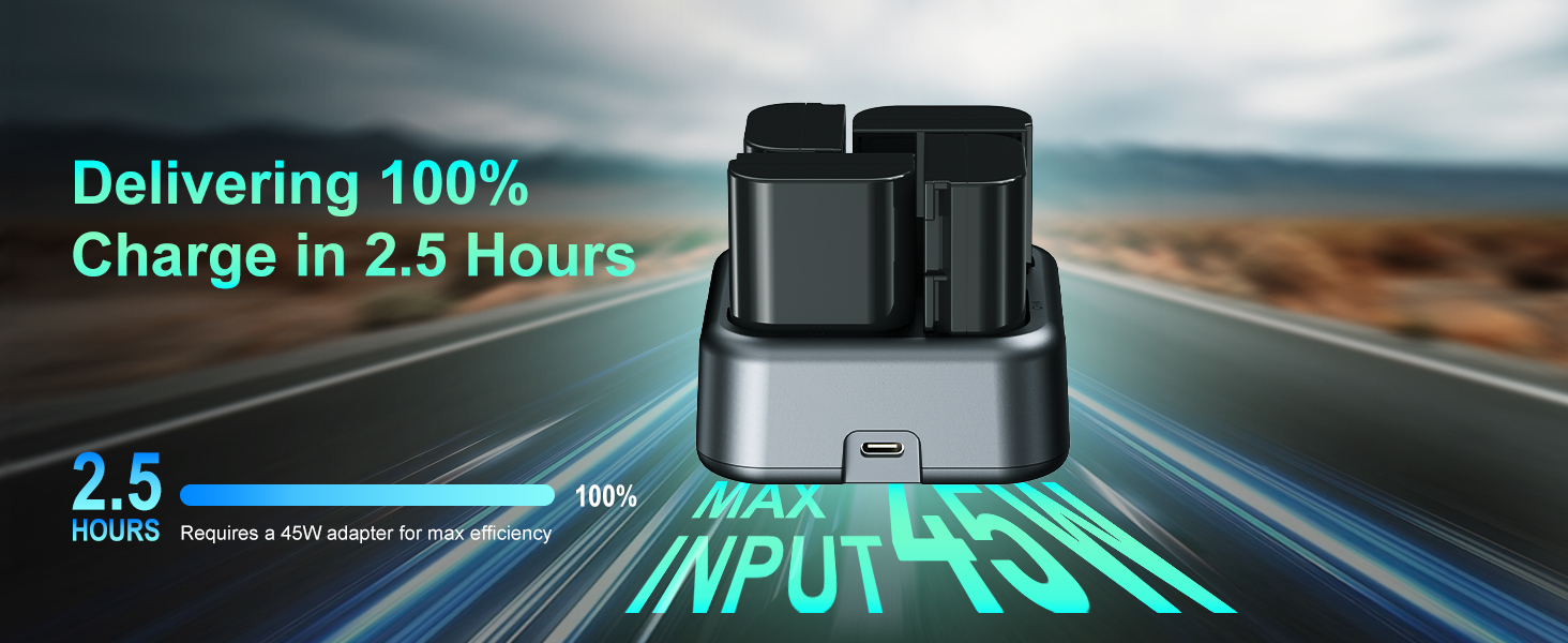 【4-Channel PD 45W Fast Charging】The Canon LP-E6 Battery Charger is equipped with 4 charging slots. Featuring a Type-C input port supporting the 45W PD fast-charging protocol, it supercharges four NP-FZ100 batteries in 2.5 hours. This significantly improves charging efficiency and saves valuable time.