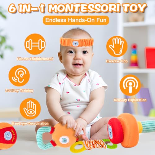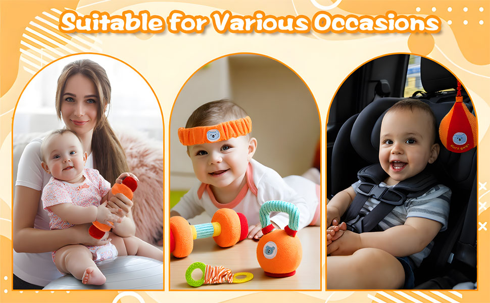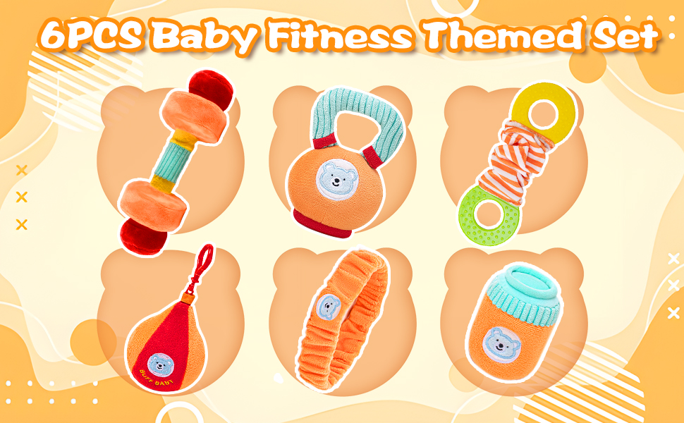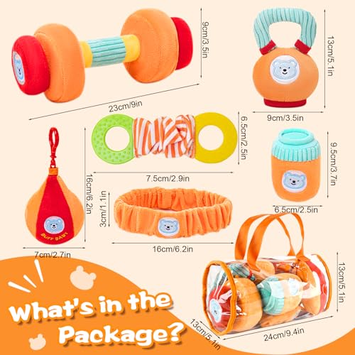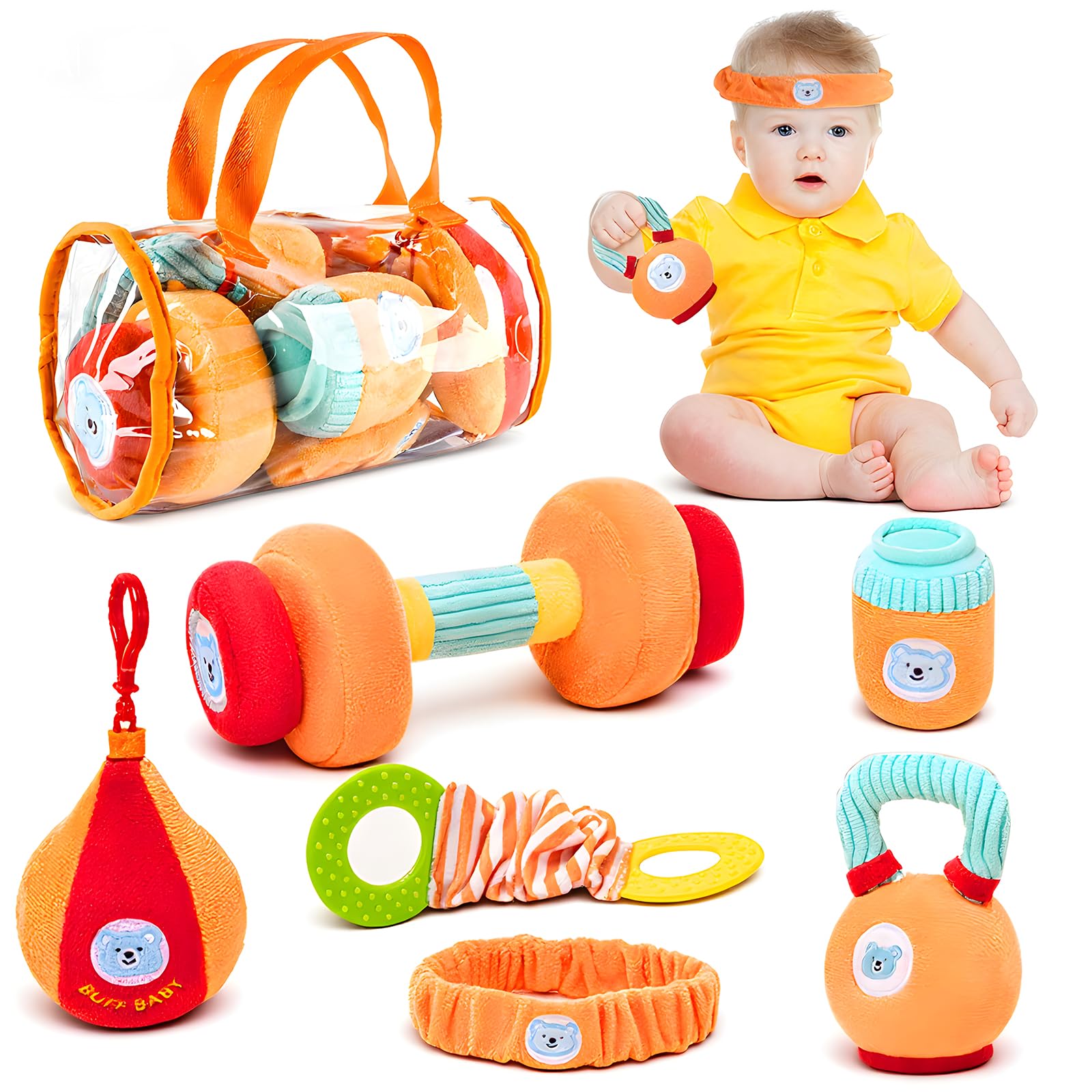 0-12 Months Rattle Toys Set: This sports-themed set includes a dumbbell, kettlebell, sandbag, water bottle, rally band, headband, and a convenient carrying bag. The different shapes of the toys spark curiosity while developing fine motor skills, making them a perfect companion for your baby's growth from newborn to toddlerhood