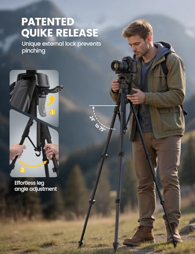 - 【Patented Rapid Leg Deployment】The Lamicall camera tripod features a patented quick-release lock, enabling swift 24°-75° leg angle adjustments and one-touch setup/takedown. Our innovative external lock design eliminates pinch hazards of conventional twist-lock systems, delivering faster operation with enhanced safety. Press, adjust, lock – all in one motion. Effortlessly adapts to uneven terrain, so you never miss the perfect shot.