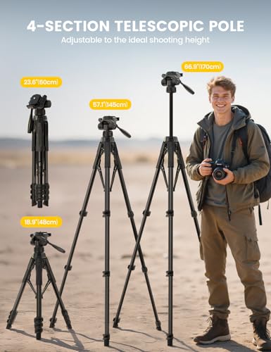 - 【3-Way Head & 4-Section Height】The professional 3-way pan head delivers 360° smooth panoramas, 180° effortless tilts, and 90° crisp vertical shots—all with dual built-in spirit level for perfect alignment. Adjustable from 19" to 67" (48cm to 170cm) with 4-stage height settings, it effortlessly transitions from low-angle macros to high-angle vlogs. Built for both outdoor adventures and indoor shoots, this tripod for camera perfect for photographers, videographers, and content creators.