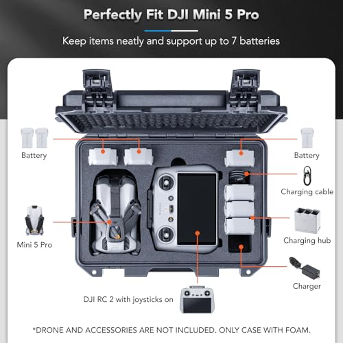 - STORAGE – Fit DJI Mini 5 Pro, DJI RC 2/RC-N3, up to 7 batteries, charging hub, charger, cables, filterset case, propellers, and more accessories