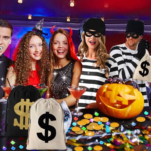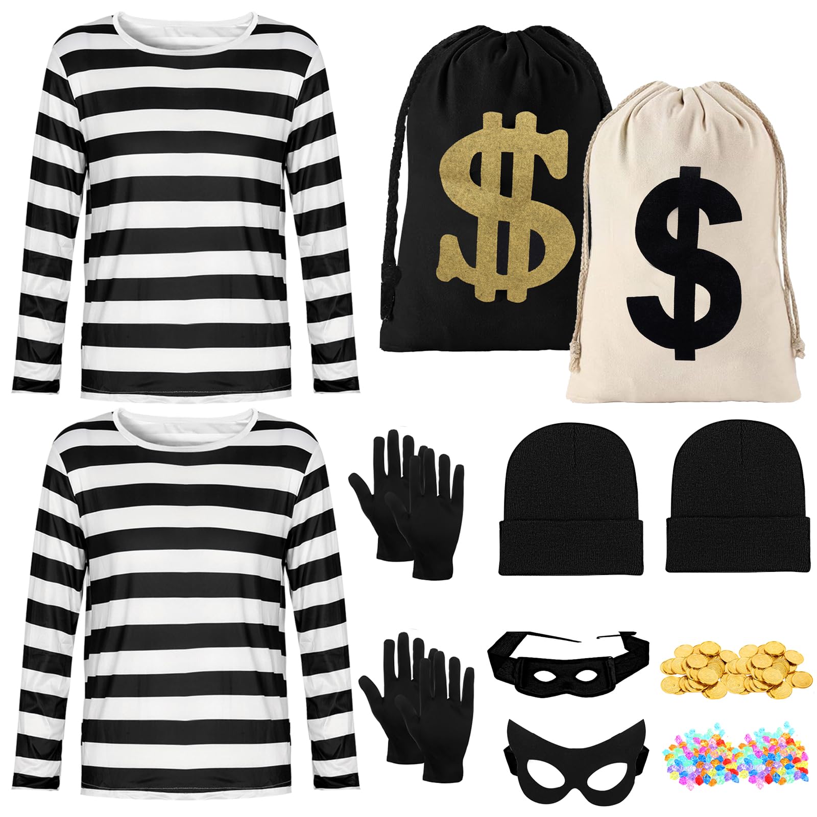 Thief Couple Costume Set This two-person thief ensemble comprises 14 pieces: Black and white striped long-sleeved T-shirts x2, Black gloves x2 pairs, Black knitted hats x2, Black eye masks x2, White drawstring money pouch x1, Black drawstring bag x1, 2 sets of plastic coins (30 coins total), and 2 sets of plastic gemstones (50 stones total). This bandit costume is perfect for couples to dress up together at Halloween parties, ensuring you become the centre of attention. The bandit striped T-shirt set is unisex and features a relaxed fit suitable for most adults, making it one size fits all. Please refer to the size chart for guidance. The black-and-white striped long-sleeved T-shirt is crafted from polyester fabric, offering breathable comfort and unrestricted movement. The drawstring money pouch features a finely woven drawstring design, combining aesthetic appeal with portability for storing small items. The black knitted beanie is made from breathable polyester fabric, ensuring comfort and warmth. Suitable for both everyday casual wear and festive occasions. The attire features a black-and-white striped design accented with colourful gemstone and gold coin embellishments. This unisex thief costume includes a dual-colour drawstring bag, combining fashion-forward appeal with everyday practicality for effortless wear. Suitable for Halloween, carnivals, themed parties, cosplay gatherings, and everyday styling. Ideal for family and friends to wear together as a stylish duo outfit, creating a perfectly coordinated thief ensemble.