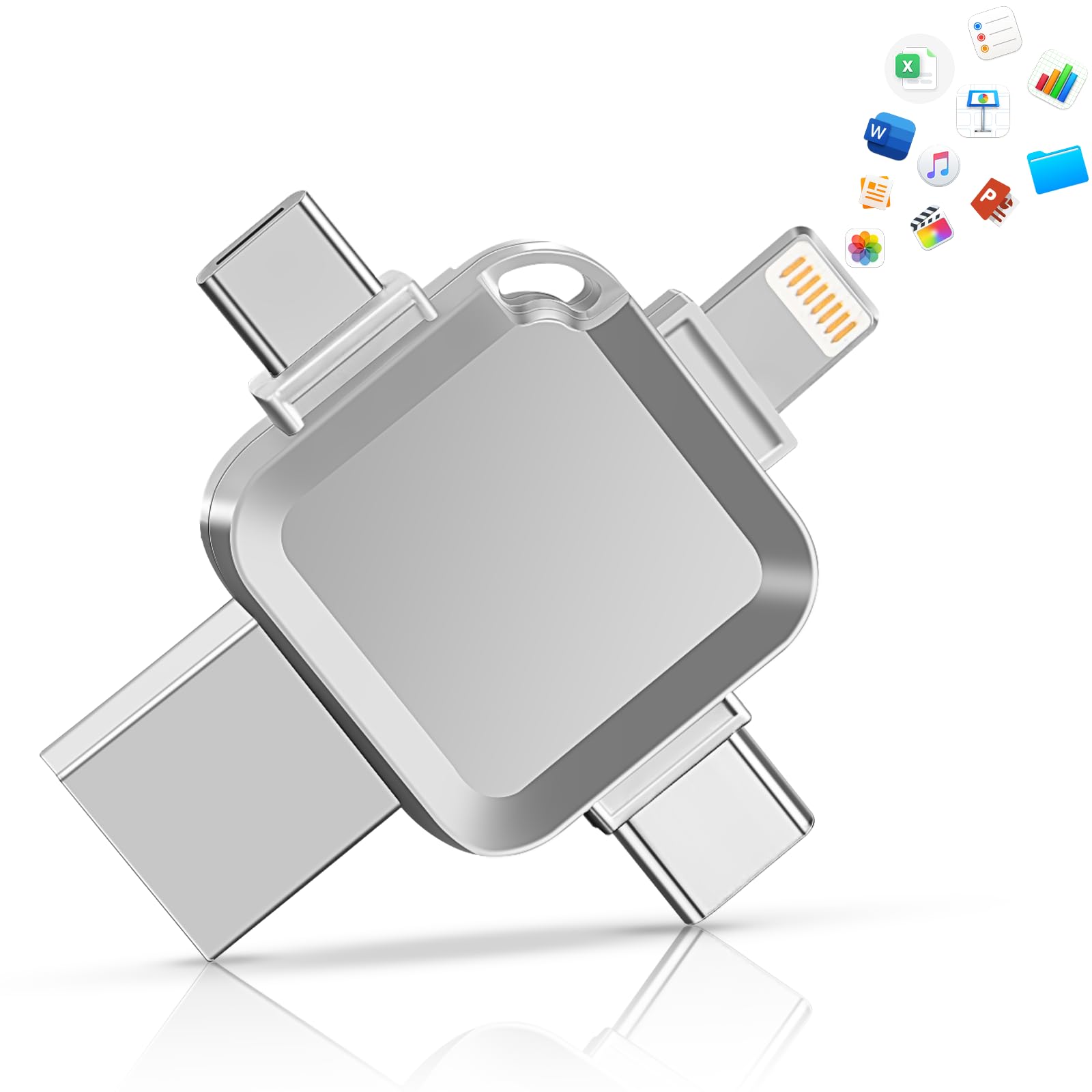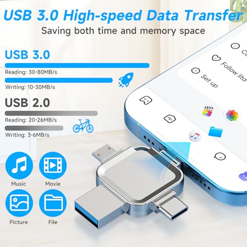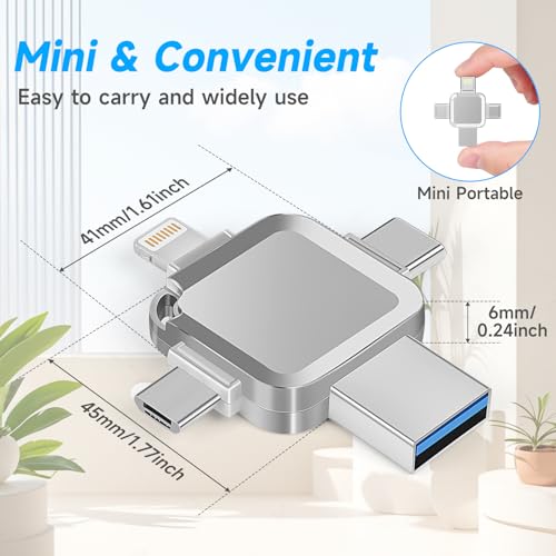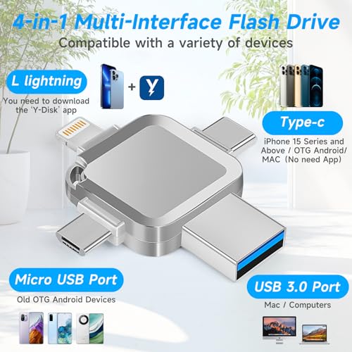 - 【4 ln 1 Multi lnterface, Efficient and Convenient】This USB flash drive is equipped with a USB/Lightning/Type-C/Micro USB four-in-one interface, which can easily meet the connection needs of various devices, say goodbye to the shackles of data cables, and achieve efficient data transmission anytime and anywhere. Whether it is a mobile phone, tablet or computer, it can switch seamlessly to meet your diverse storage needs.