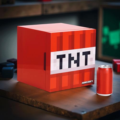 The UKONiC Minecraft TNT Mini Fridge brings pixel power to your desk or bedroom. Officially licensed by Mojang/Microsoft, this block-styled thermoelectric cooler looks exactly like an in-game TNT cube while discreetly holding up to six 330 ml cans. Its compact cubic form fits neatly on a shelf or beside a monitor, giving any gaming setup an instantly recognisable, themed focal point that’s equal parts fun and functional. The unit cools approximately 15–18°C below ambient and offers flexible storage with a removable shelf and internal door holder for snacks or small bottles. Dual-power capability means you can plug into a UK mains socket at home or use the included 12V car cable for journeys and events. Supplied with both AC and DC fittings, it’s a practical, portable solution for chilled drinks during long sessions or late-night streams. Packaged in vibrant full-colour gift boxing, the UKONiC Minecraft TNT Mini Fridge makes a brilliant present for gamers, students, or anyone who loves a touch of game-inspired décor. Easy to use, neatly sized, and ready to display, it’s an ideal gift for birthdays, housewarmings, or for upgrading a bedroom or home-office setup. Practical, quirky and noticeably Minecraft, it’s sure to be a conversation starter. KaBoom!