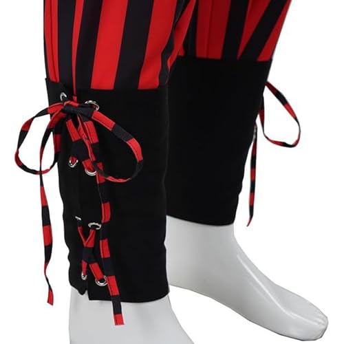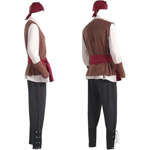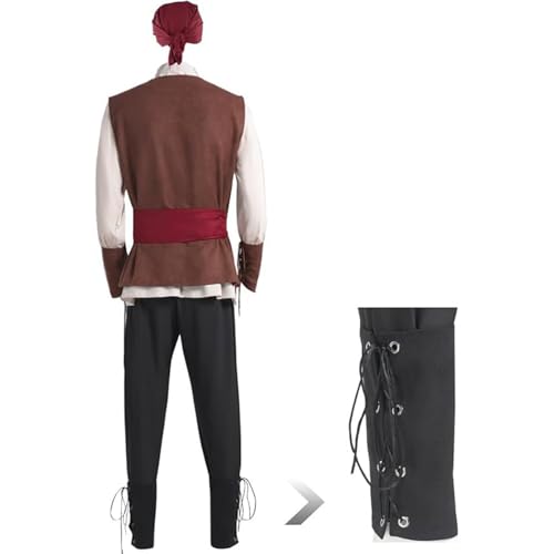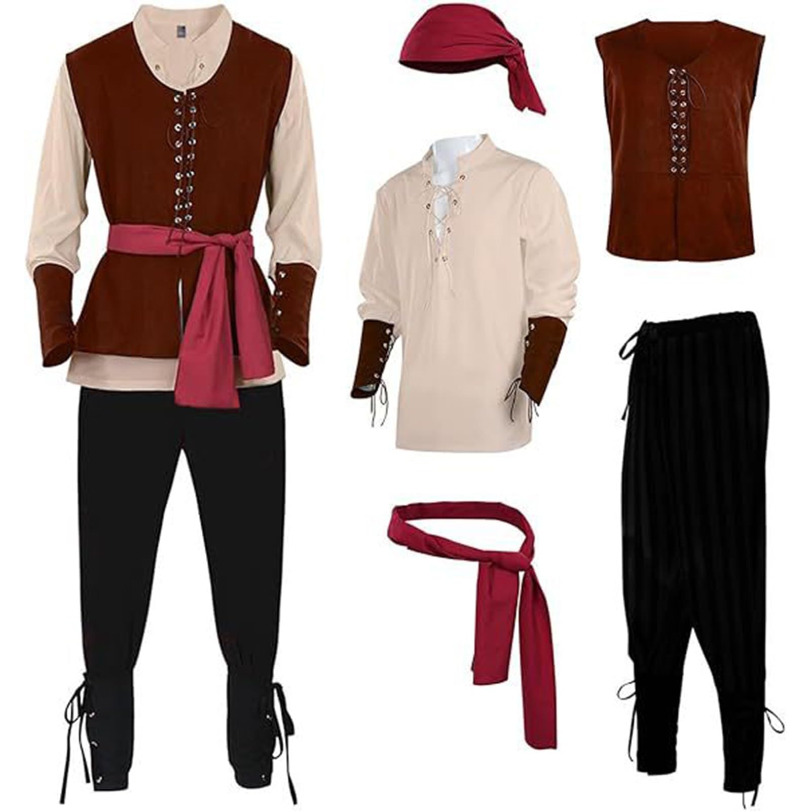 Set Sail in Timeless Pirate Style – Authentic 5-Piece Medieval Costume for MenStep into the golden age of seafaring adventure with this complete 5-piece men’s pirate costume set, designed to capture the bold spirit of medieval explorers, Renaissance buccaneers and legendary rogues. The set includes a lace-up shirt, sleeveless vest, red-and-black striped ankle-tie trousers, a long waist sash and a matching headscarf – everything you need to transform into a true pirate captain. Inspired by historical garments from the Viking era to the Renaissance period, it blends heritage style with modern comfort, making it perfect for Halloween, stage performances, themed parties and historical festivals.The breathable, skin-friendly fabric ensures you stay comfortable throughout the day, whether you’re acting on stage, joining a carnival parade or exploring a cosplay event. The lace-up design on the shirt and cuffs adds a touch of authenticity while allowing you to adjust the fit for maximum comfort. The sleeveless vest adds structure and detail, while the striped trousers with ankle ties offer flexibility and ease of movement. A long sash belt lets you customise the silhouette, and the classic headscarf completes the iconic pirate look with bold character.Every element of this costume is crafted to deliver historical realism and practical wearability. Reinforced stitching and quality finishing ensure durability, while the adjustable design suits a range of body types. Beyond pirate characters, this costume is ideal for portraying steampunk adventurers, Renaissance villagers, or Viking raiders, making it versatile across many themes and occasions.Whether for Halloween parties, theatre performances, LARP events, cosplay conventions, school plays or historical reenactments, this pirate costume set ensures you’ll stand out with a striking and authentic look.