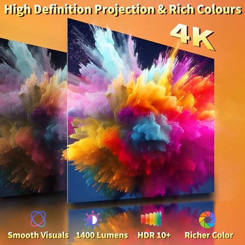 【High-Definition Video with 4K Compatibility】Featuring a 1920×1080 Full HD resolution and the ability to decode 4K Ultra HD videos, this portable projector employs advanced LED technology offering 1400 lumens and a contrast ratio of 10000:1. Whether enjoying films, TV series, or gaming, it provides an engaging visual spectacle, transforming your home into a cinema.