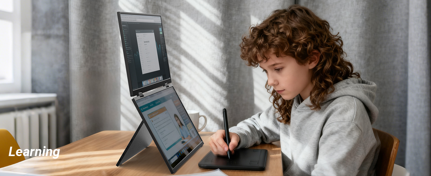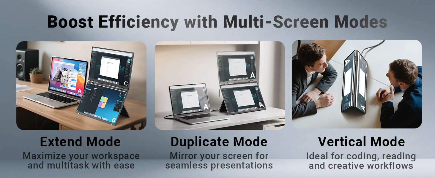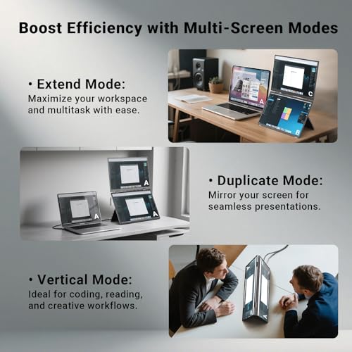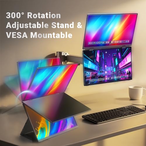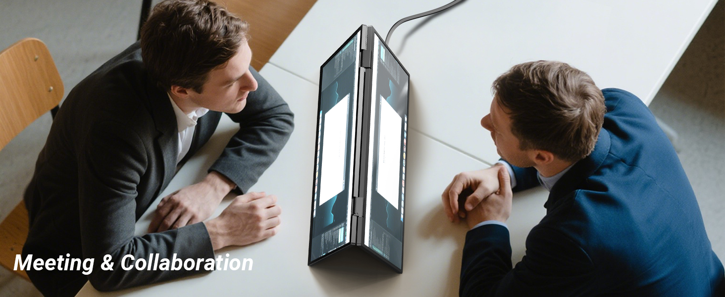- Flexible Rotation & Team Collaboration: The vertical stacked layout minimizes neck movement compared to wide monitors, helping sustain focus in long sessions of research, editing, or financial analysis. With up to 300° rotation, two people can work together face-to-face on dual screens, making real-time seamless collaboration. Wide viewing angles further support information sharing across desks or meetings. Ideal for students, creators, analysts, and traveling professionals seeking a portable dual-screen hub for teamwork and productivity