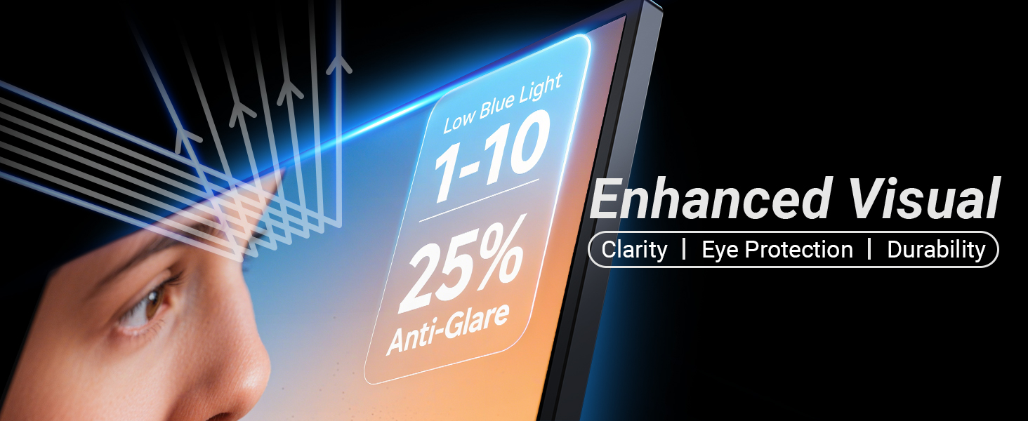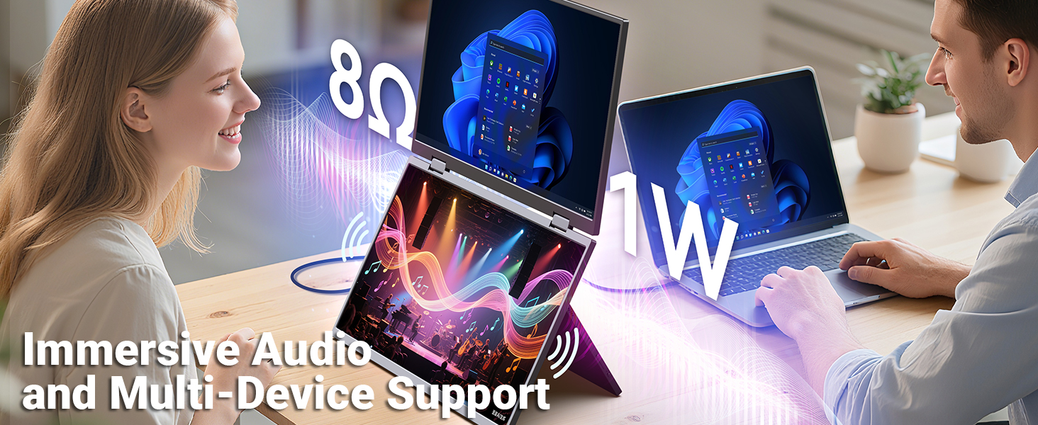 - Eye Comfort & Easy Controls: Low Blue-Light technology helps reduce eye strain during long study or office hours. Brightness is adjustable from 20-300 nits, ensuring comfort whether you're working late on flights or presenting in bright meeting rooms. Dual 8Ω1W speakers support video calls, tutorials, or demos without needing extra accessories. One-touch power/menu and quick keys simplify adjustments mid-workflow