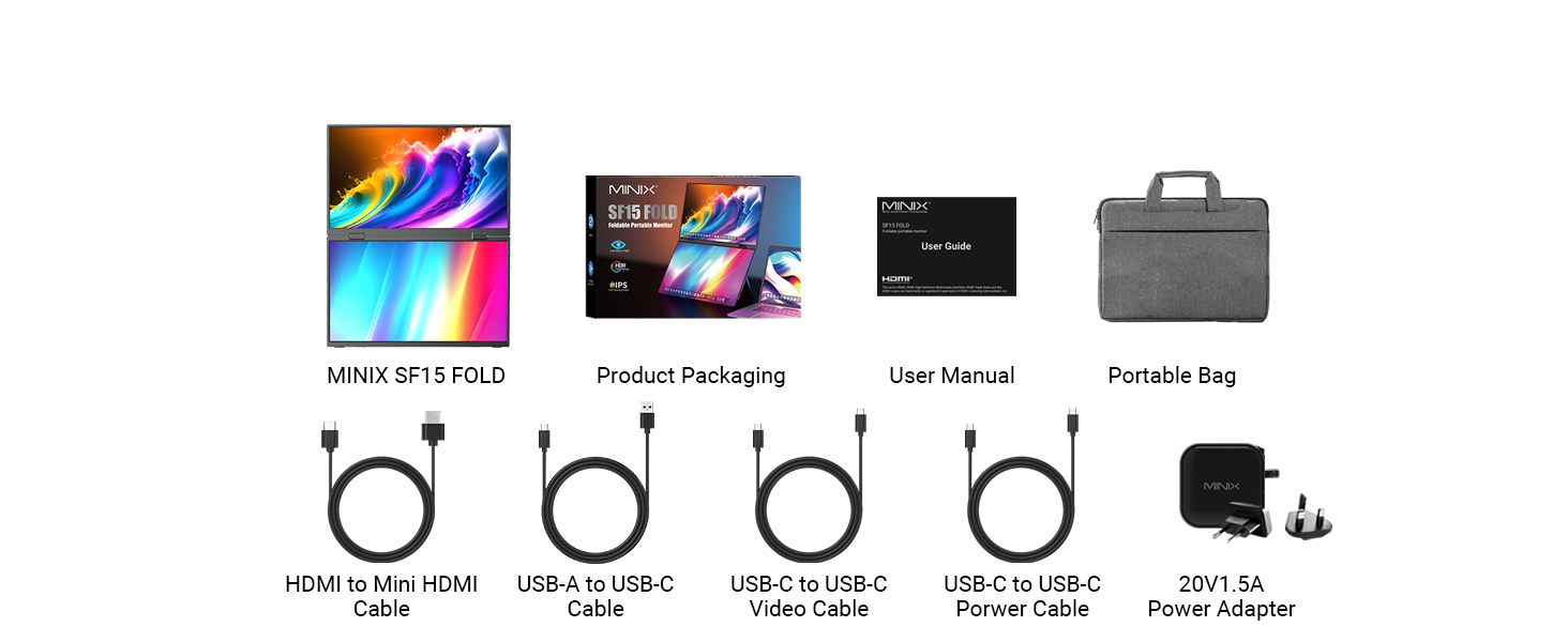 MINIX SF15 Fold Dual 15.6″ Foldable Portable Monitor, 1080P FHD, 300 nits, 100W PD, Low Blue Light, Recyclable Metal, Type-C & HDMI for Laptops, Study, Creative Projects, Office Collaboratio