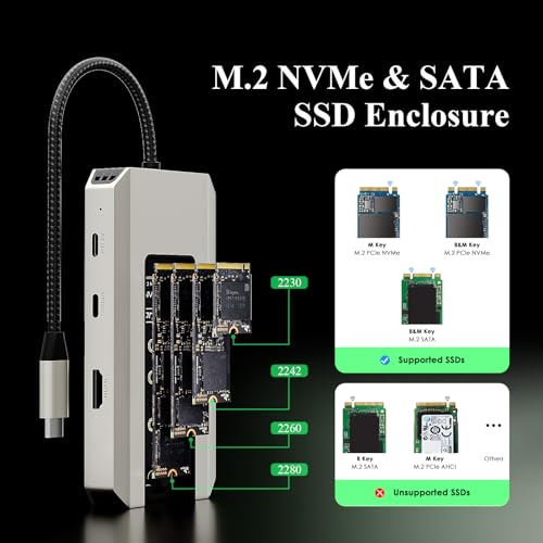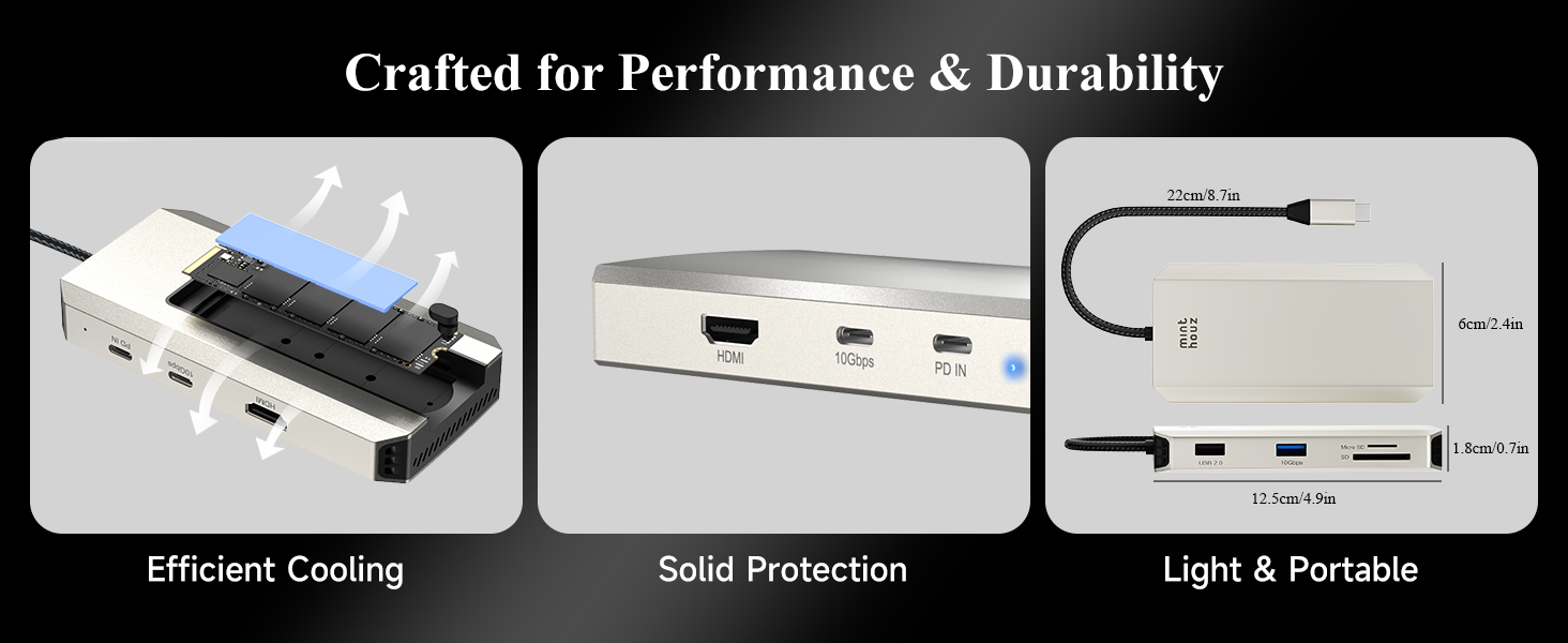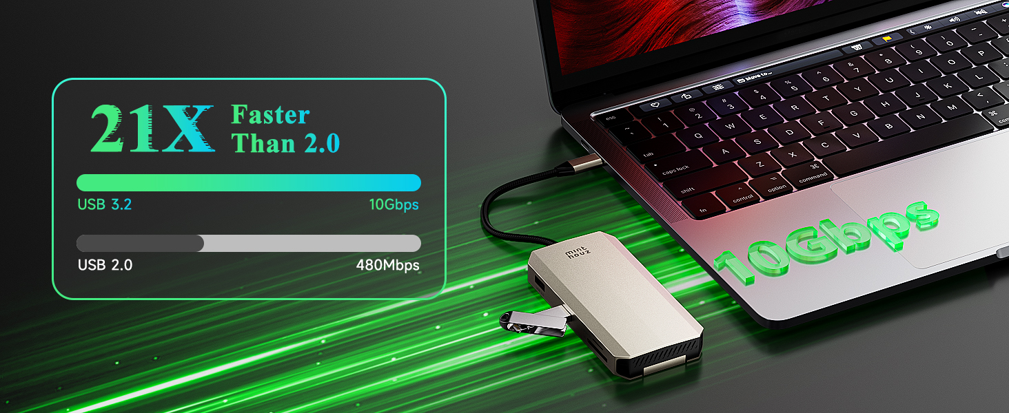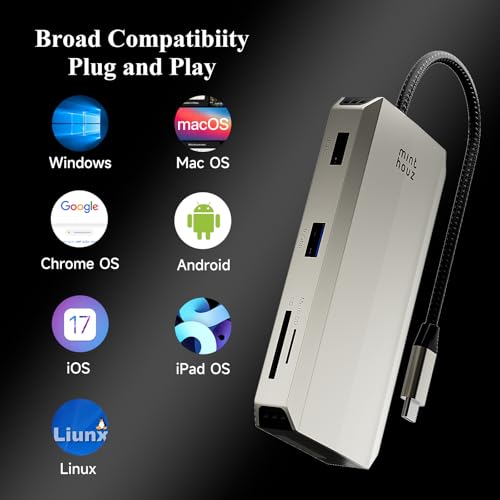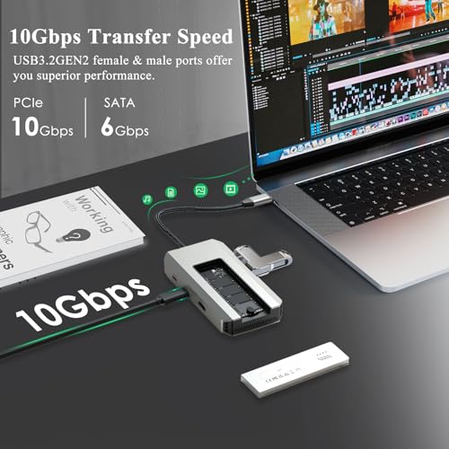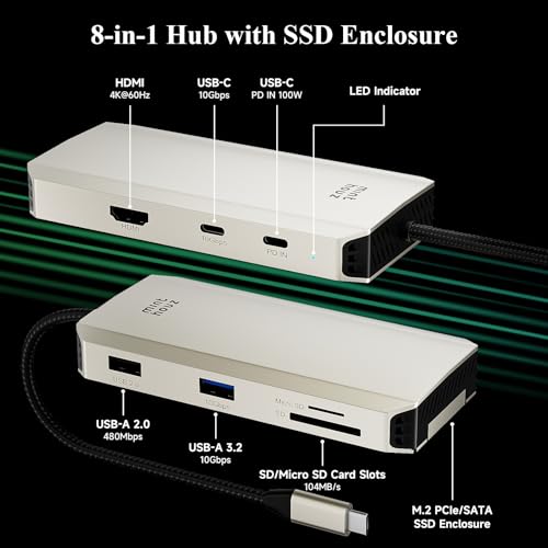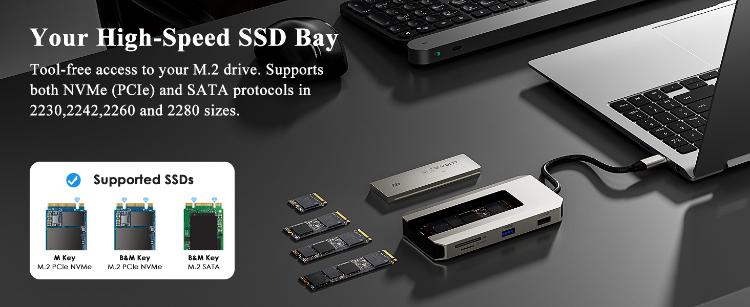 This Minthouz 8-in-1 USB-C dock combines several practical features: support for M.2 SSD protection, 4K HDMI video output, 10 Gbps high-speed USB A/C ports, USB-C power input, SD/TF card reader, and a USB A 2.0 port for connecting wireless devices. This single dock comprehensively meets all your diverse needs!