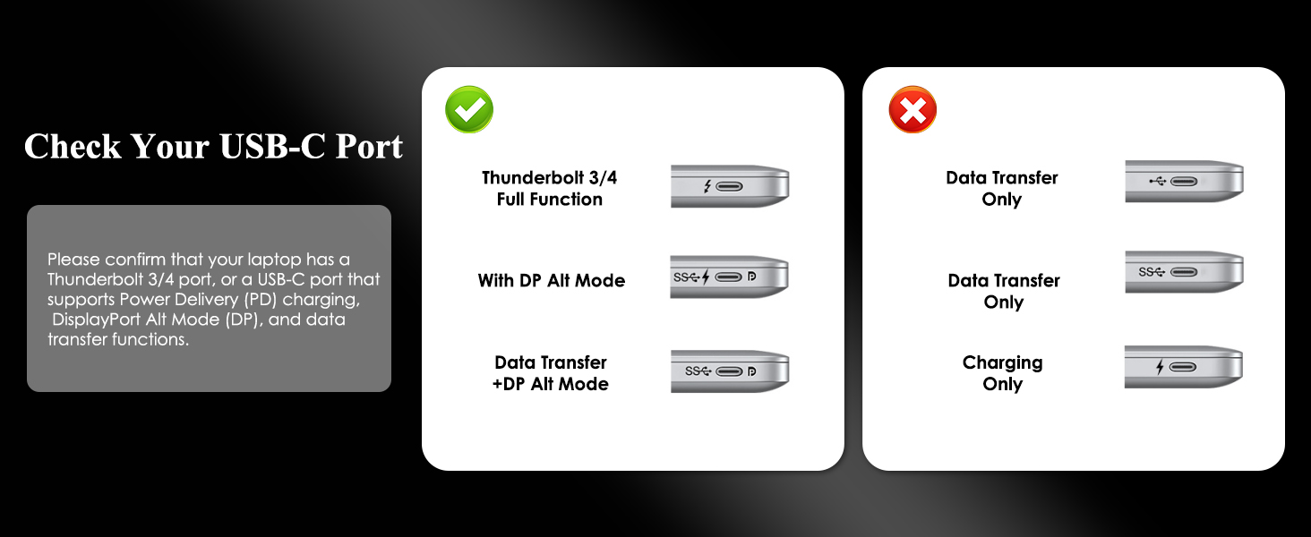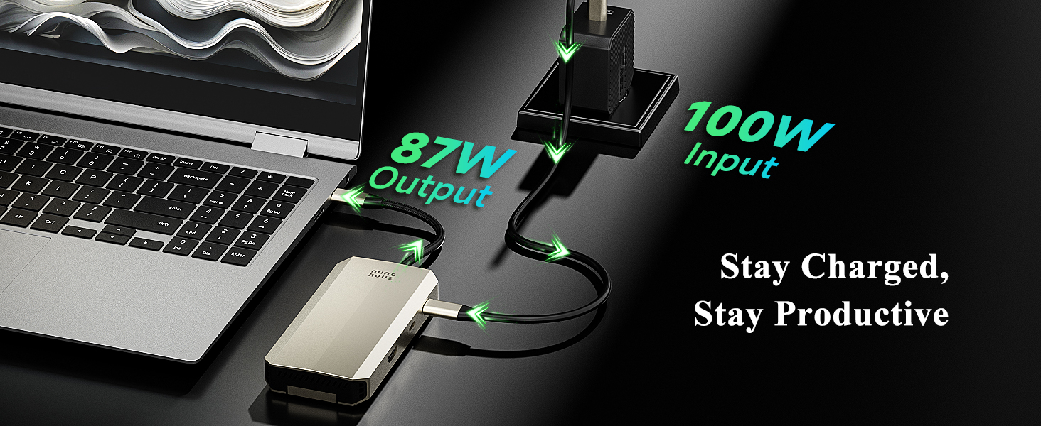 87W USB-C charging station – Say goodbye to weak batteries! 100W/87W USB-C charging station that supports laptop charging. Please note: Our product does not include a charger; use a 20V/5A/100W charger. Check your laptop's charging power – charging will not work if it exceeds 87 W.