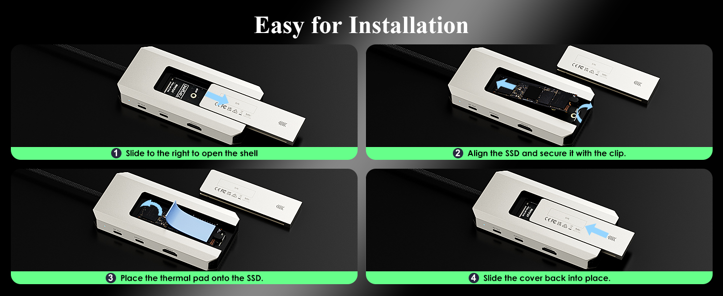 Additional design features: Supports 4K at 60 Hz, making it particularly suitable for demanding tasks such as gaming and video editing (DisplayPort 1.4). Equipped with a USB-A/C output with a transfer speed of 10 Gbit/s, enabling instant transfer and backup of photos, music, films and large files – simply perfect! A dedicated USB-A 2.0 port for wireless devices – incredibly convenient! Simply slide the cover open to quickly and easily install the SSD.