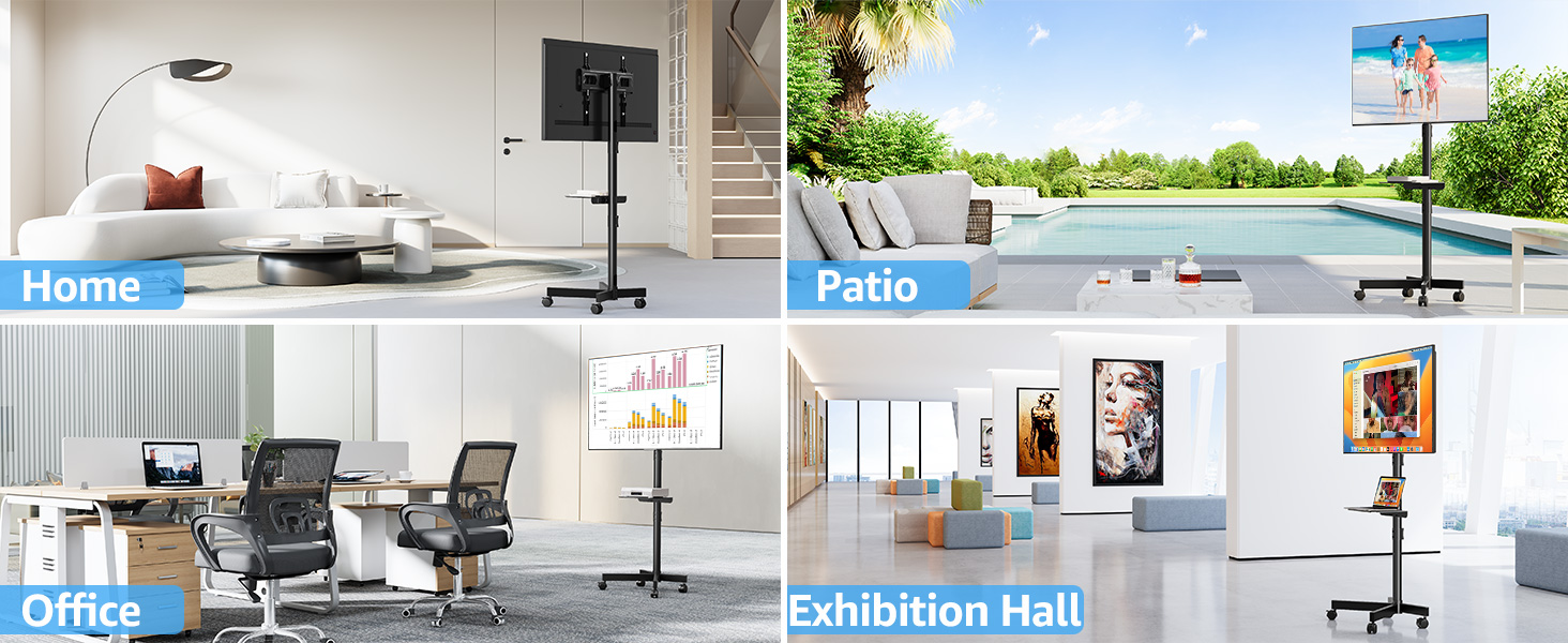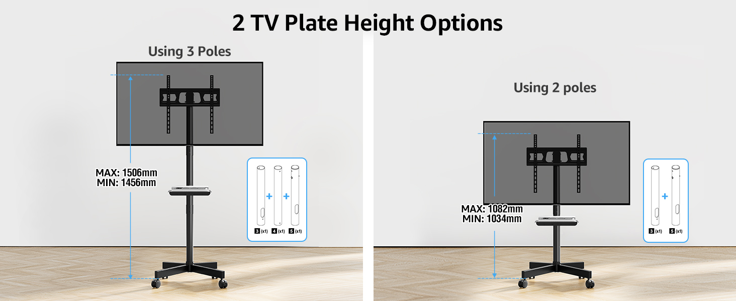 Smooth Mobility with Lockable Wheels: Move your TV effortlessly! Movable TV stand wheels allow you to easily move the TV from room to room and the rolling TV cart's wheels are easily locked to ensure safety. Of course, portable TV stand's wheels made of high-quality materials will not make loud noises like other wheels
