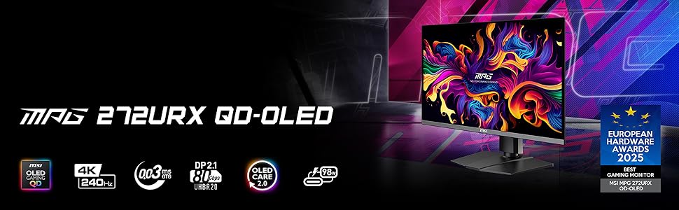 QD-OLED—The MSI MPG 272URX QD-OLED gaming monitor is equipped with a 5-layer tandem OLED panel featuring EL Gen 3 technology, which improves efficiency up to 30%. This monitor offers stunning clarity with 166 PPI and ensures reliable performance.