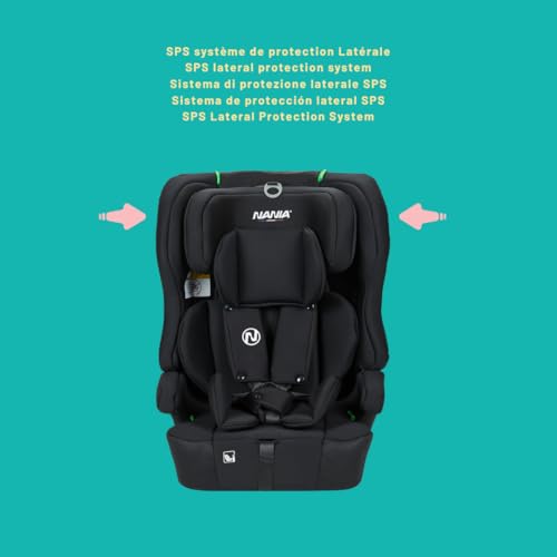 Safety: The nania car seat has dedicated safety systems (SPS). The reinforced SPS or side protectors protect the child's shoulders and hips. The headrest is adjustable to 10 positions and offers simultaneous adjustment of the headrest and internal harnesses. You can adjust it with one hand