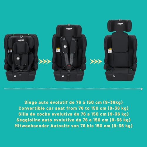 EVOLUTIVE: A car seat for children with a height between 76 and 150 cm (approx. 15 months to 12 years old or 9 to 36 kg. – Headrest adjustable in height to 10 positions – 5-point belt system automatically evolves for children up to a height of 105 cm and a maximum weight of 18 kg – Easy conversion for use in the size category 100-150 cm: the 5-point belt fits into the child car seat without being dismantled. – Removable and washable comfort insert