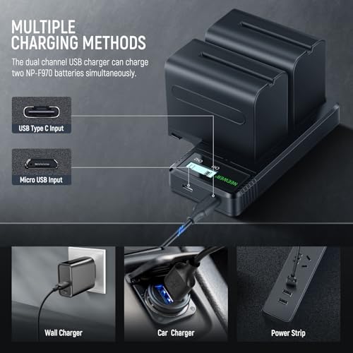 - 【Wide Compatibility】 Compatible with Sony NP-F550 NP-F570 NP-F750 NP-F770 NP-F960 NP-F970 NP-F975 NPF batteries. A battery charger for gear and equipment including Neewer LED panel lights, field monitors, wireless camera sliders, and compatible with Sony Handycam camcorders. Ideal as content creator essential backup battery power supply and influencer must have photography accessories