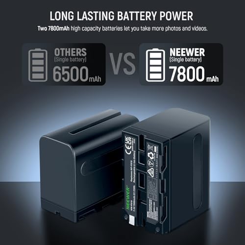 - 【2PCS Upgraded 7800mAh Replacement Batteries】 NEEWER NP-F970 rechargeable lithium ion battery features a high capacity (7.2V 7800mAh 56.16Wh) and offers a longer battery life than common NP-F batteries. Manufactured with premium cells, it can provide you with abundant and consistent battery power for travel and capturing every wonderful moment in life