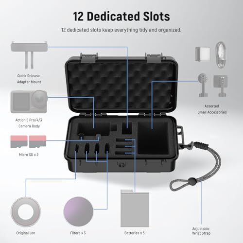 【12 Dedicated Slots】 12 slots keep everything tidy and organized. 1x slot for Action 5 Pro/4/3 camera body; 1x slot for quick release adapter mount; 2x slot for micro SD cards; 3x slot for batteries; 1x slot for the original lens; 3x slot for filters; 1x slot for assorted small accessories (cables, action camera adapters, fill lights, and others). Compatible with DJI Osmo Action 5 Pro Adventure Combo accessories