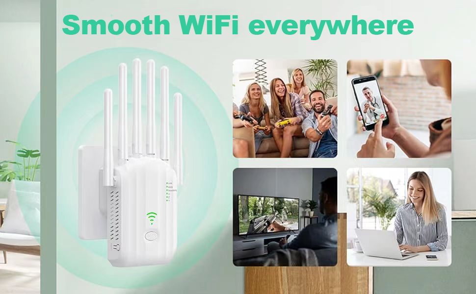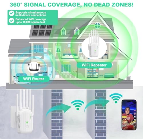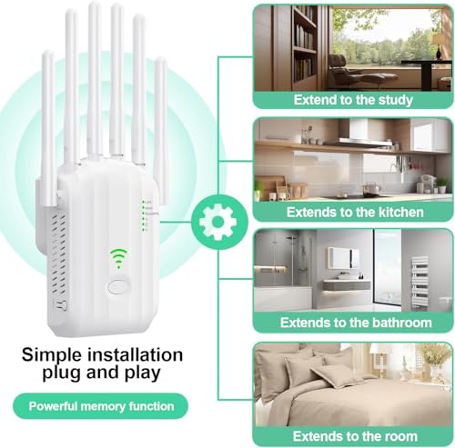 - 【Upgraded 6 Antennas】Equipped with 6 high-gain antennas, this WiFi extender provides excellent coverage throughout your home. It extends Wi-Fi coverage up to 6,800 sq ft, enhances wireless performance, and ensures a reliable internet connection in every corner.