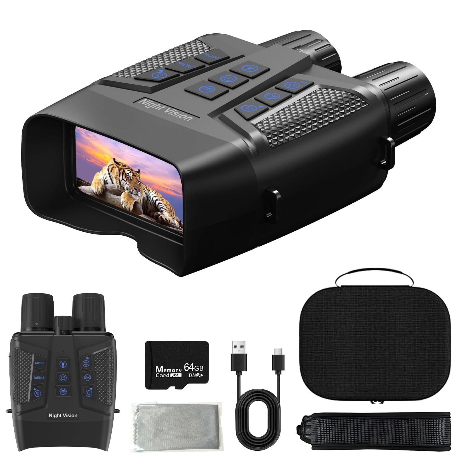 What You Get – 1 x 4K Full Color Night Vision Goggles、1 x 64G Card、1 x Exquisite Gift Box、1 x Neck Strap、1 x USB Cable、1 x User Manual、1 x Cleaning Cloth. We offer 365-days warranty for our night vision goggles.