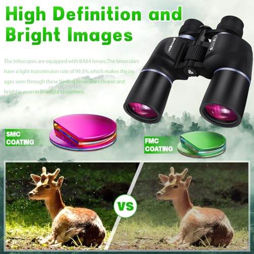 - [Brighter and Clearer Imaging]Powerful binoculars for adults are coated with SMC coating which is better than FMC,with BAK4 prisms to make the image clearer,and the target can be observed even in low light conditions.