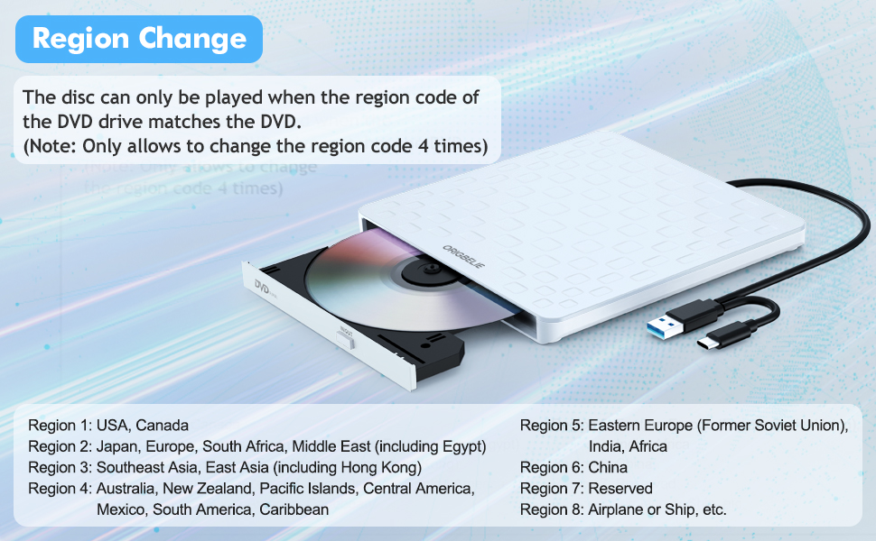 - 【All Kinds of Disc】The USB DVD drive external support read and write multiple formats discs including CD±R/RW, CD-ROM, DVD±R/RW, DVD-ROM, DVD-RAM, DVD+R DL, DVD-R DL, VCD e SVCD. It also can be used to listen to music, watch movies, data backup, burn files, install software, operating systems or games. If the CDs or DVDs failed to read by computer, use the charging cable included in the packge to connect to 5V charger or power bank to get extra power, because some computer doesn't have enough power to support the operation of the external CD DVD drive.