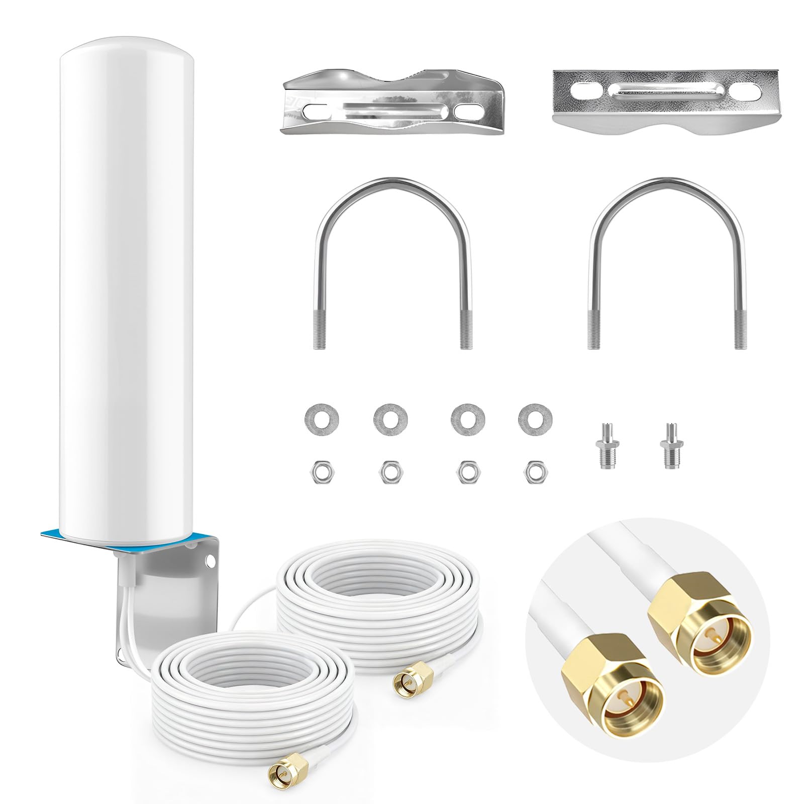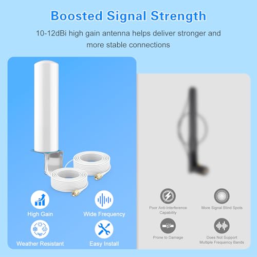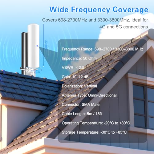 - High Gain Outdoor 4G 5G Antenna: Designed with 10-12dBi gain, this omni-directional 4G 5G LTE antenna provides broad frequency coverage from 698-2700MHz and 3300-3800MHz. Comes with dual 5m RG174 SMA male cables, ideal for enhancing data rates, improving stability and helping reduce latency on your home or business network.