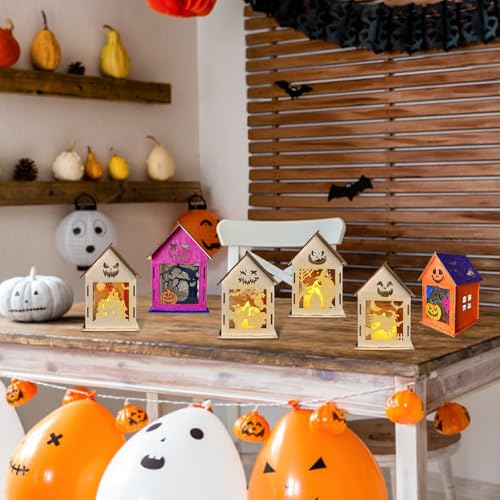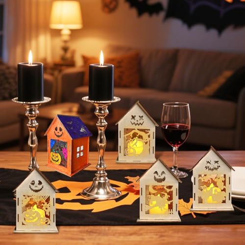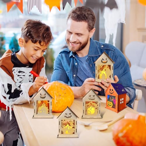 Pack of 6 Halloween Lanterns Craft Set, DIY Halloween Ghost House Craft Sets, Wooden Lantern for Children, Crafts and Painting, Wooden Lantern with LED Candles, Tea Light Holder for Halloween, Gif