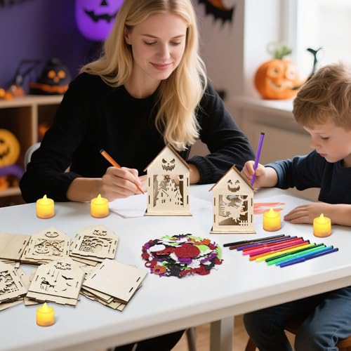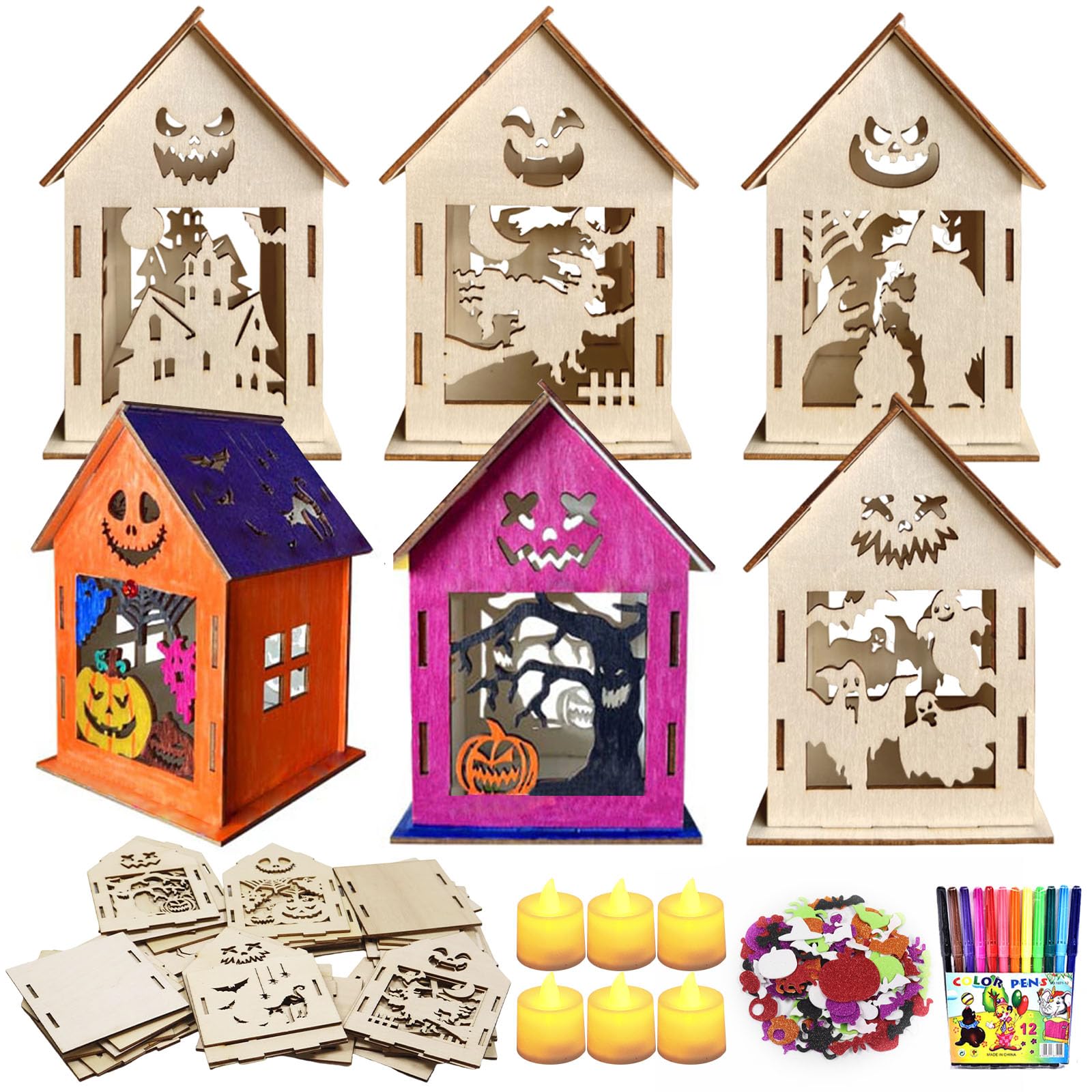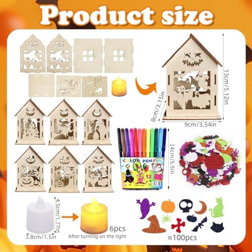 - Halloween house craft kit for kids: you will receive 6 wooden witch house pumpkin with classic Halloween elements such as pumpkins (6 designs), 1 set painting brush, 1 set stickers and 6 lamps. The Halloween pumpkin house craft set is perfect for Halloween craft decoration with children
