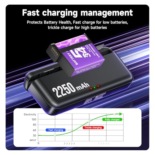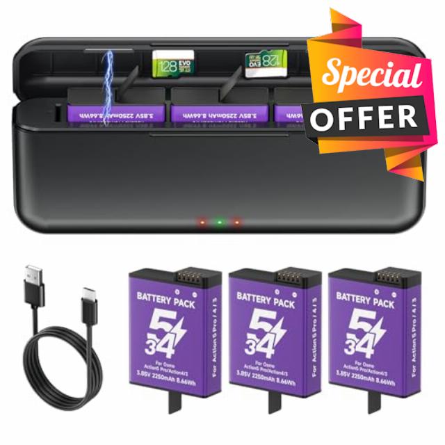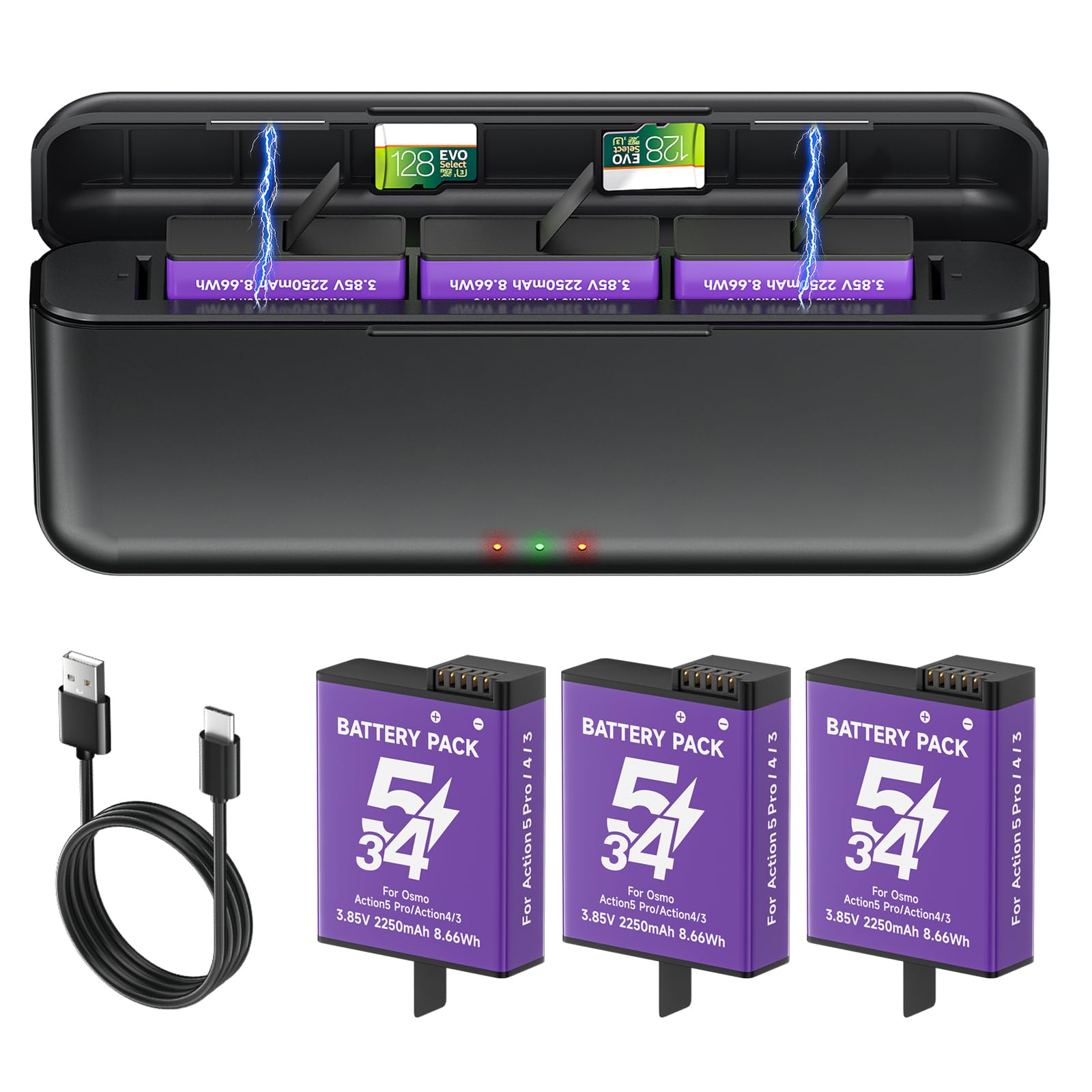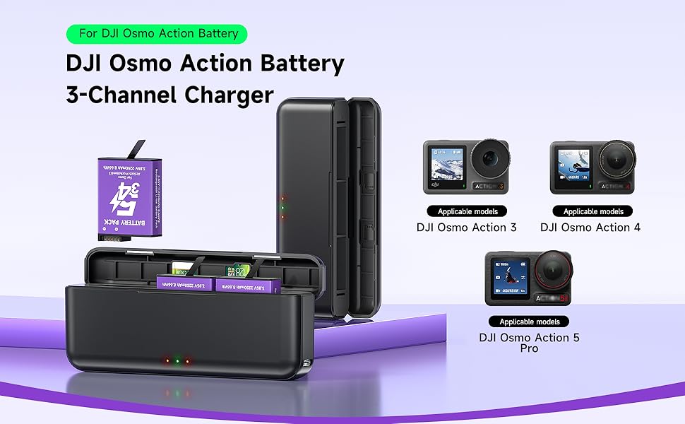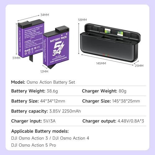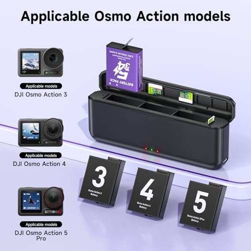 - 【Compatible with DJI Osmo Action 5pro/4/3】DJI Osmo battery and charger kit is compatible with DJI Osmo Action 5pro, Action 4 and Action 3 cameras, perfect for your camera equipment. Meanwhile, the high capacity battery can last for a long time to meet the needs of your device for long time shooting.
