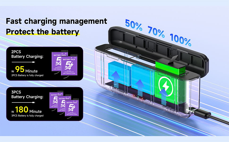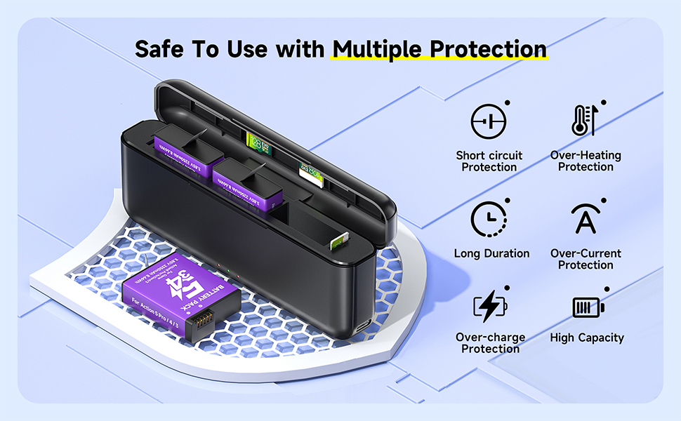 - 【Protection mechanism】The charger has a built-in intelligent control chip with protection against overcharging, over-discharging, over-voltage, over-current and overheating. Multiple circuit protection ensures safety and stability, which can help you use DJI Osmo Action 5 Pro camera more safely.