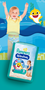 Your baby is free to make a splash in Pampers Splashers disposable swim nappies! Unlike regular nappies, Pampers Splashers swim nappy pants don’t swell in water: they fit like swimwear and protect like Pampers! With their delightful Baby Shark designs, they will soon become a must for little fans! For secure protection in the water, Pampers Splashers Dual Protection cuffs fit snug around your baby’s legs to help contain mess, making them perfect for the pool, beach, splash park and more. Their unique 360° stretchy waistband fits comfortably and easily pulls on and off—even when wet! Pampers Splashers are also equipped with Easy-Tear Sides for a quick disposal and less mess.