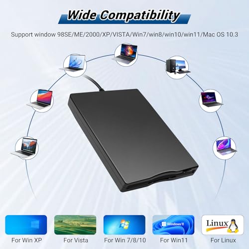 - "【Wide Compatibility – Portable Floppy Disk Drive for Data Access】 Easily read, write, and transfer data from your old 3.5-inch floppy disks with this portable floppy disk drive. Designed for nostalgia and data recovery, it’s perfect for accessing archived documents, vintage software, or treasured family photos stored on floppy disks. Compatible with Windows 10 / 8 / 7 / Vista / XP / ME / 2000 / SE / 98"