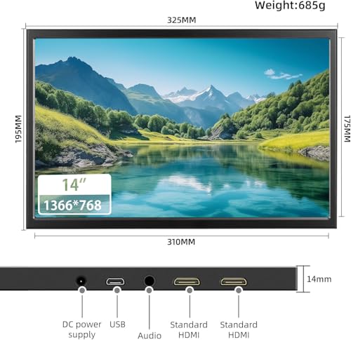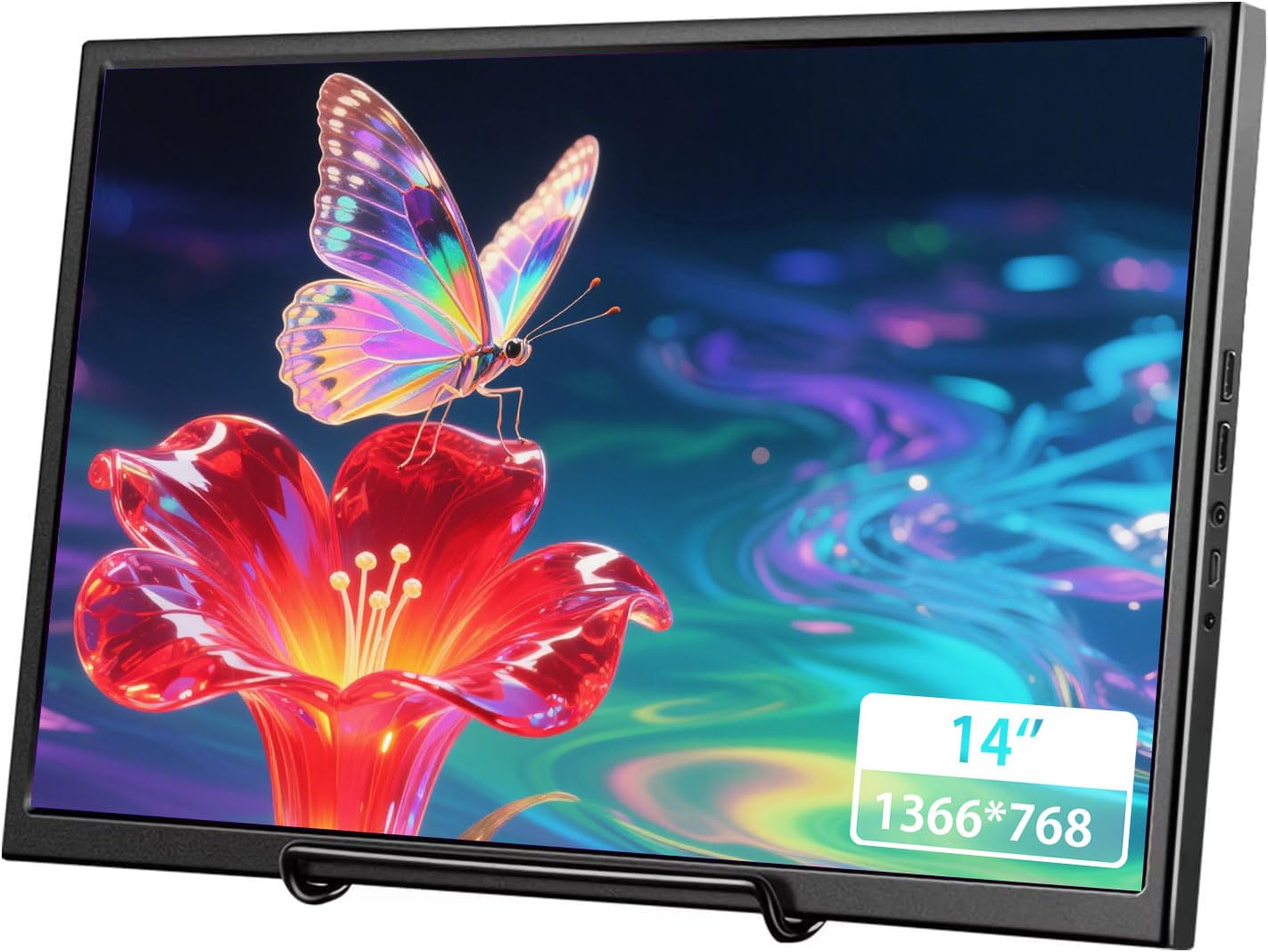 Portable Monitor 14 inch Small External Monitor with Dual HDMI Interface for Raspberry pi PS4 Laptop PC Computer Microsoft Win OS,1366×768,PC 16:9 Color Display Scree