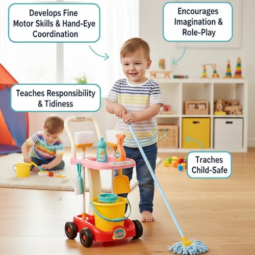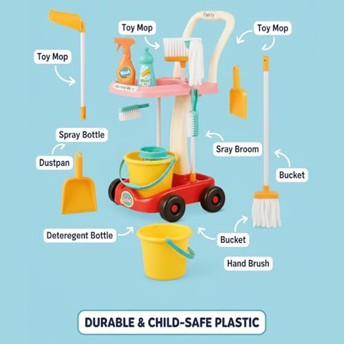 - BRIGHT COLOURS AND EYE-CATCHING DESIGN FOR KIDS – Designed in vibrant and attractive colours, the trolley and cleaning tools capture children’s attention instantly. The playful yet realistic design sparks curiosity and encourages kids to engage in role-play activities, boosting their creativity, imagination, and social skills.