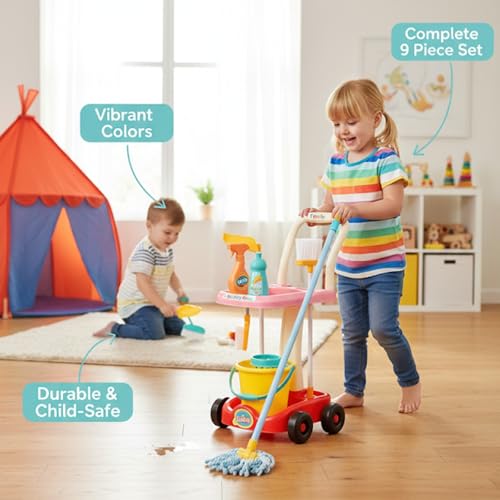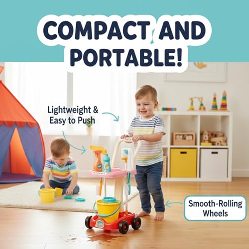 - LIGHTWEIGHT, PORTABLE, AND EASY TO STORE – The compact and lightweight design allows children to easily push, pull, or carry the trolley from one room to another. Its detachable and space-saving structure makes it convenient for storage after playtime. Ideal for both indoor and outdoor play, this cleaning playset provides endless fun while keeping your space clutter-free.
