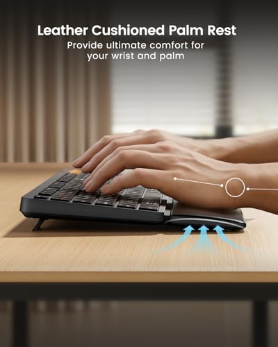 - 【Adjustable Typing Angle for Comfort】The wrist rest keyboard features two adjustable tilt legs on the back, allowing you to lift the bottom of the keyboard to a comfortable typing angle of 7°. This incline design helps promote a more natural wrist position, reducing strain and enhancing typing comfort—perfect for both seated and standing desks.