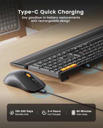 - 【Rechargeable & Power-Saving】This rechargeable keyboard and mouse set features built-in lithium batteries (500mAh for the keyboard, 300mAh for the mouse) and can last up to 45 days under typical use. Recharge easily via the included Type-C cable, and enjoy smart power-saving with auto sleep mode after 60 minutes of inactivity.
