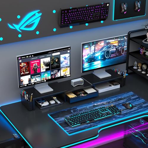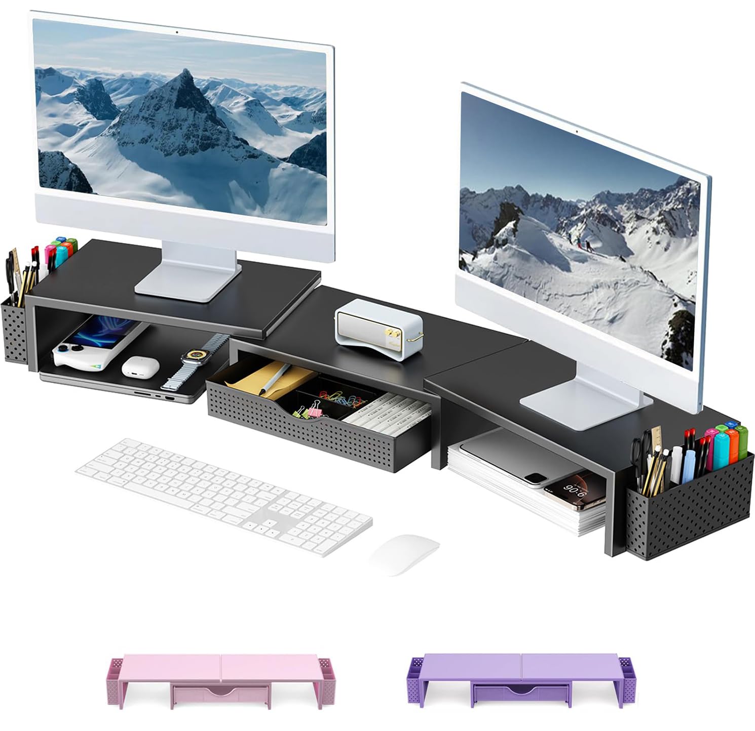 - 【Ample Storage Space】The dual monitor stand features two magnetic pen holders and a drawer, allowing you to easily organize your desk accessories and office supplies, keeping your workspace clear and tidy for easier access