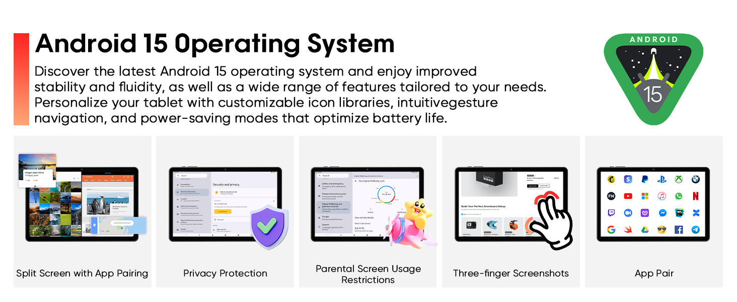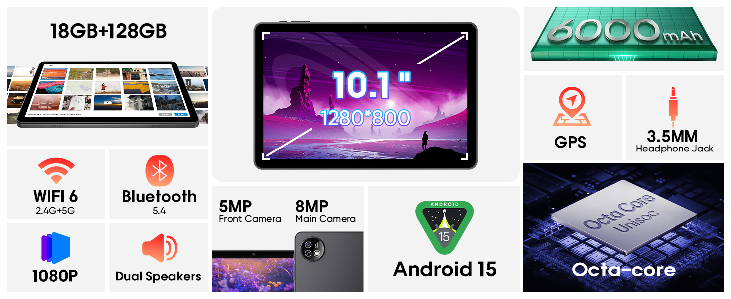[Octa Core Android 15 Tablet] The Android tablet features the operating system Android 15 and an 2.0 GHz octa-core processor. ensure of excellent performance, seamless multitasking, getting rid of unexpected ads, emphasizing privacy and security by designing enhanced app permissions, giving users complete management control.this 10 inch tablet easily zips through everyday apps and games. Say goodbye to lag and hello to seamless multitasking.