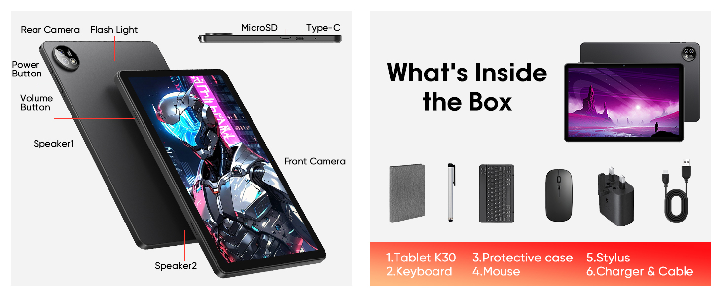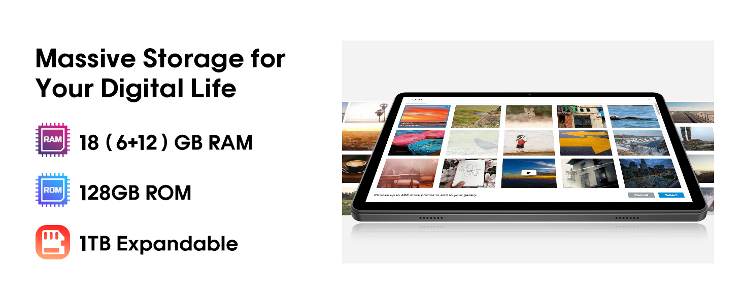 [Extra Storage Capacity] Immerse yourself in a world of infinite possibilities with this 10-inch Android tablet featuring 18(6+12)GB RAM + 128GB ROM. Expand the storage capacity by adding 1TB with an SD card(not included), allowing the 10-inch tablet to store your favourite movies, music and more. Enjoy endless mobile entertainment with everything you love at your fingertips!