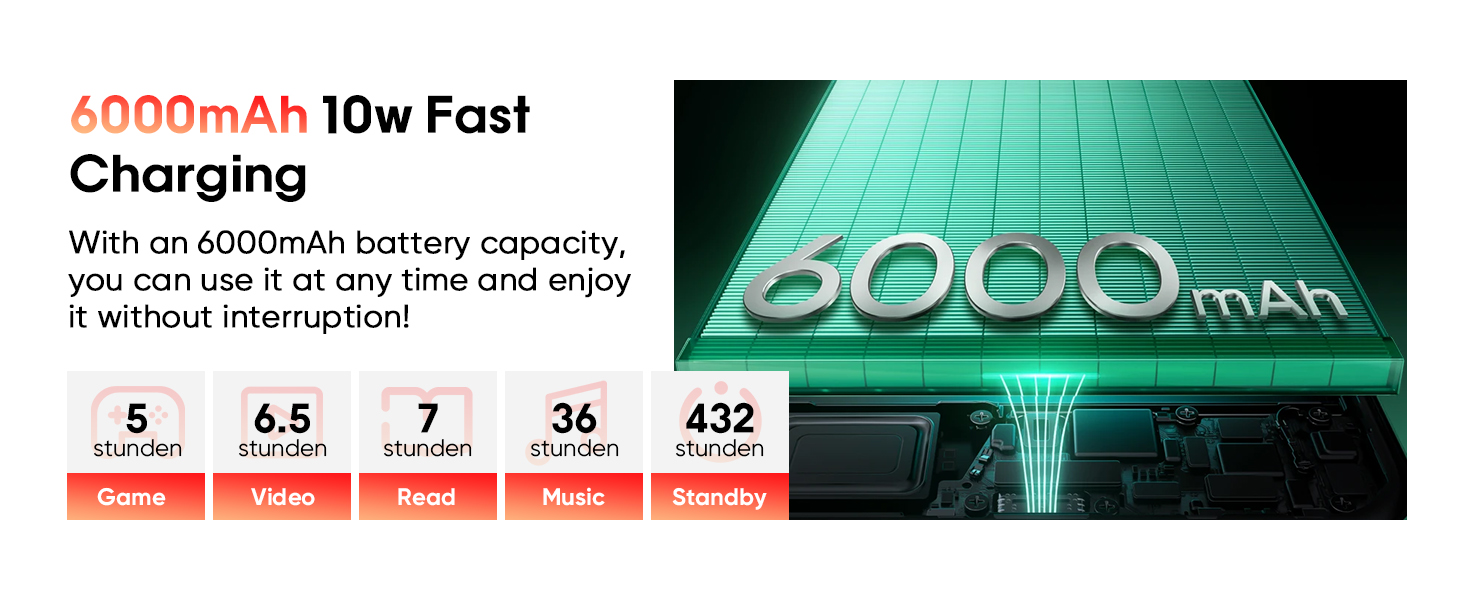 [Long-Lasting Battery Life] Built-in 6000mAh high-capacity battery, combined with the intelligent power management function of Android 15 system, is able to meet the needs of daily use. Even under intense use, it can maintain a long battery life and reduce the trouble of frequent charging.