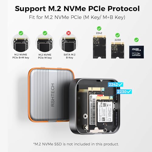 - RSHTECH M.2 NVMe SSD Enclosure: Designed for NVMe SSDs with M Key & M+B Key interfaces, compatible with 2230/2242 form factors. RSHTECH m.2 NVMe caddy supports plug-and-play, no drivers required.