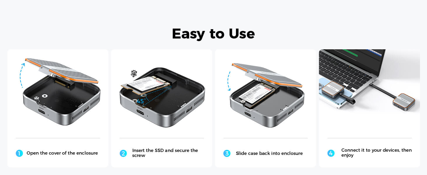 - Blazing 10Gbps Data Transfer: The NVMe SSD Enclosure lets you easily turn an internal M.2 NVMe SSD into a portable external USB 3.2 SSD, with data transfer speeds reaching up to 10Gbps. It works great for expanding storage on smartphones, laptops, tablets, and game consoles, plus quickly transferring and backing up large files.