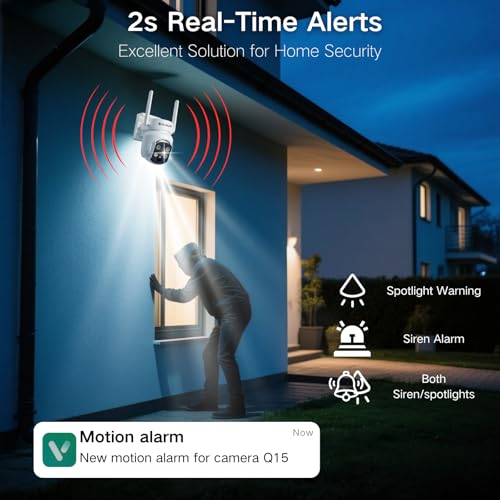 2K HD + 360° View :4MP ultra-clear resolution & 4x digital zoom provide sharper details than 1080P. 355° pan & 120° tilt eliminate blind spots. Dual infrared + LED lights ensure full-colour night vision up to 15m. allowing you to monitor your driveway or garden with ease.