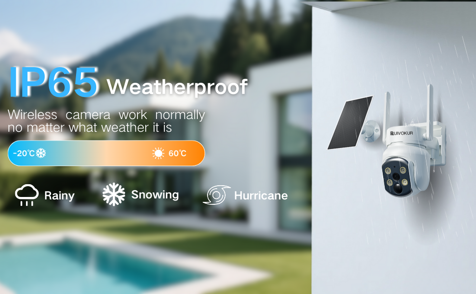 Solar/Battery Powered & 100% Wireless:5200mAh battery + solar panel (3m cable) for continuous power. No wires needed—install in minutes. The home security cameras with an IP65 waterproof rating,it is designed to withstand rain, snow, and harsh weather conditions.
