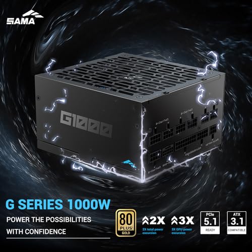 SAMA G1000 Power Supply – 1000W Fully Modular 80 Plus Gold Certified ATX 3.1 & PCIE 5.1 Compliant Japanese Capacitors 150mm FDB Fan Supports RTX 50/40 Series GPUs – Black