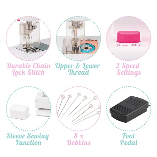 ACCESSORIES: the Sewing Studio a complete set with everything your child will need when joining this exciting hobby. It includes 6 bobbins, scissors, measuring tape, 8 headed pins, threader and 3 spools of clutch bag. Get the full experience sewing experience with our features